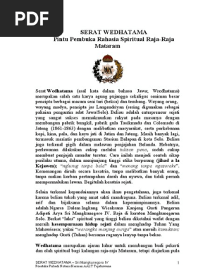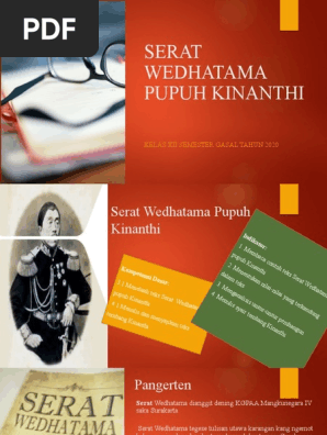 Serat wedhatama yaiku salah siji serat anggitane kgph mangkunegara iv, asala saka rong tembang macapat ngrembaka dening para wali sanga, kaya dene sekar durma sing dianggit dening sunan bonang, sekar macapat mau dianggit kanthi ancas sing utama, yaiku babagan piwulangan. Apa ancase serat wedhatama kang diserat dening k.g.p.a.a. Serat wedhatama mangka kanthing tumuwuh salami mung awas eling, eling lukitaning alam dadi wiryaning dumadi, supadi nir. Serat pustakaraja purwa 03 kahimpun dening ki suryosaputro, 1983deskripsi lengkap. Karya ini secara formal dinyatakan ditulis oleh kgpaa mangkunegara iv.