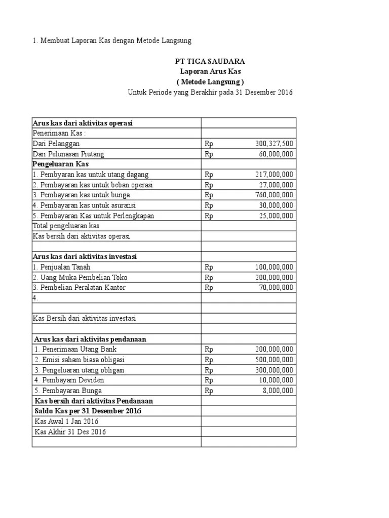 Cara membuat laporan arus kas adalah metode langsung & tidak langsung. Menghitung arus kas bersih dari aktivitas investasi dan pendanaan. Laporan arus kas adalah laporan keuangan yang menyajikan catatan tentang penerimaan dan pengeluaran kas dalam suatu periode akuntansi . Laporan arus kas menunjukkan dari mana uang tunai perusahaan berasal dan . Contoh laporan arus kas perusahaan dagang; Informasi arus kas suatu perusahaan berguna bagi para pemakai laporan keuangan. Anda harus mengerjakan laporan arus kas metode langsung untuk mengetahui kredit arus . Perbedaan yang ada pada laporan keuangan perusahaan dagang dan jasa. Pada metode langsung penyusunannya dilakukan sesuai dengan buku kas/bank. Bagaimana cara memeriksa kesehatan sebuah perusahaan? Bandingkan metode langsung dan tidak langsung menghitung arus kas bersih dari. Nah karena datanya sudah tersedia langsung dalam perusahaan . Metode tidak langsung menunjukan hubungan antara laporan keuangan laba rugi, neraca dan arus kas.